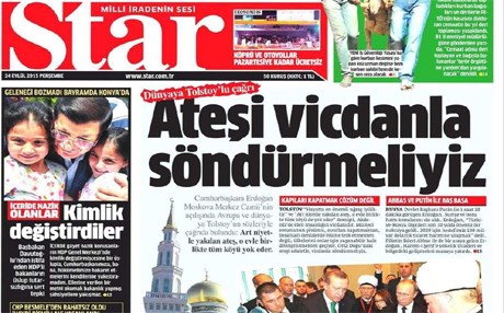 Türkiye Cumhurbaşkanı Recep Tayyip Erdoğan’ın Rusya Devlet Başkanı Vladimir Putin’le görüşmesini manşetten veren Star gazetesi, Erdoğan’ın Tolstoy’dan alıntı yaptığı sözlerini aktardı.