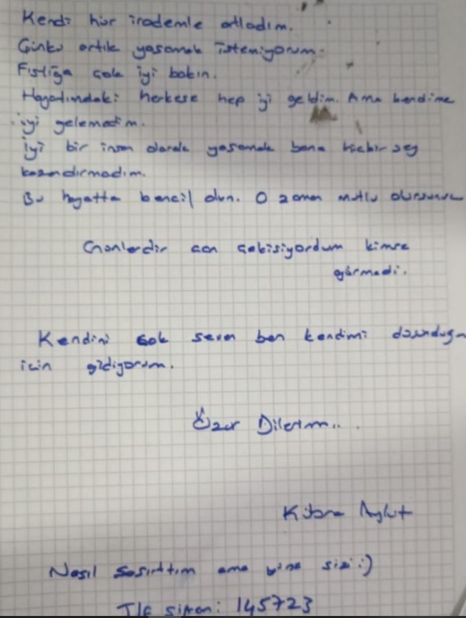 Mektupta, "Kendi hür irademle atladım. Çünkü artık yaşamak istemiyorum. Fıstığa çok iyi bakın. Hayatımdaki herkese iyi geldim. Ama kendime iyi gelemedim. İyi bir insan olarak yaşamak bana hiçbir şey kazandırmadı. Bu hayatta bencil olun. O zaman mutlu olursunuz. Günlerdir can çekişiyordum, kimse görmedi. Kendini çok seven ben kendimi düşündüğüm için gidiyorum. Özür dilerim. Nasıl şaşırttım ama yine sizi" ifadeleri yer aldı.