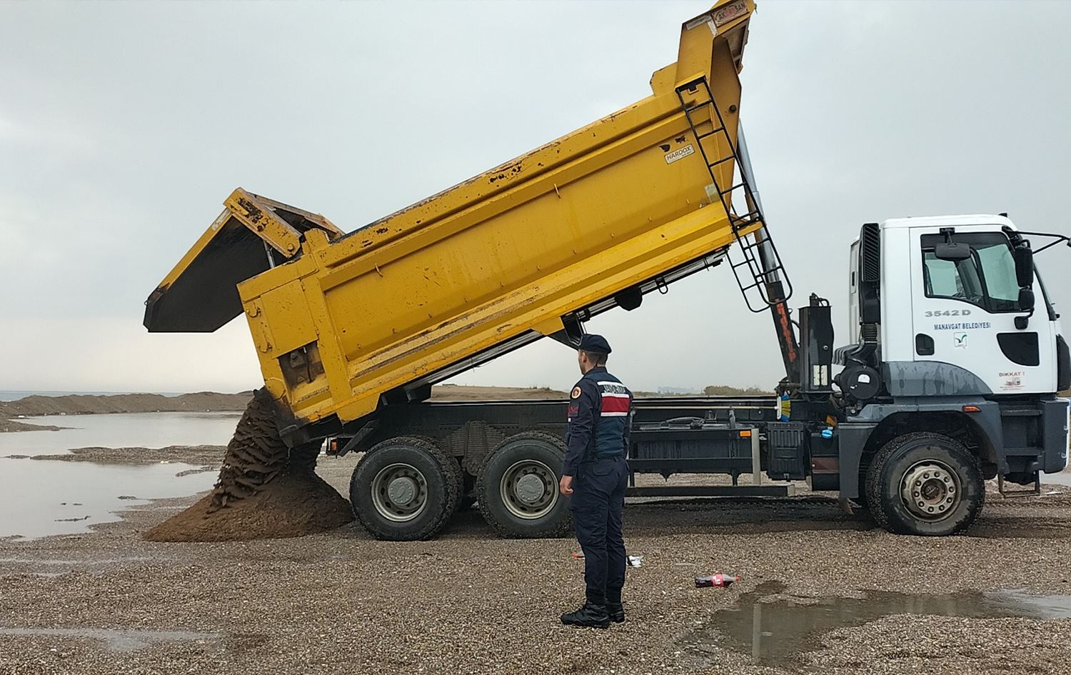 Manavgat Merkez Jandarma Komutanlığı ekipleri, çalınan kumların doğal yapıda bozulmaya yol açmaması için çalışma başlattı.