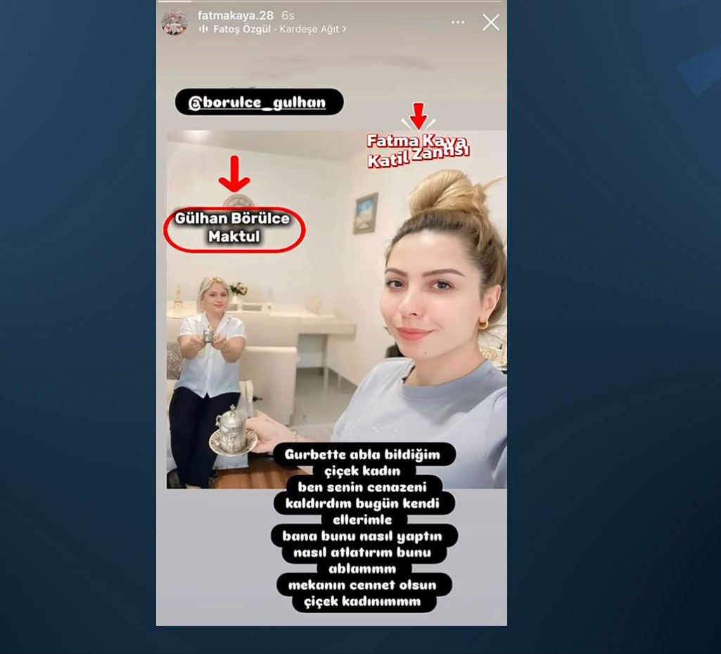 Gazeteci Sercan Bilgi ise sosyal medya hesabından yaptığı bir yayında, katil zanlısının eşi Fatma Kaya’nın Gülhan Börülce ile kahve içerken çekilmiş bir fotoğrafı ‘Gurbette abla bildiğim çiçek kadın. Sen bunu nasıl yaptın’ şeklinde sosyal medya hesabından paylaştığını aktardı. Bilgi, Fatma Kaya’nın 17 yerinden bıçaklanmasına rağmen komşularına Gülhan Börülce’nin 'intihar' ettiğini söylediğini iddia etti. Ayrıca öldürülen kadının bacağında bir kadına ait olma ihtimali yüksek ısırık izinin olması cinayetin Şükrü Kaya’nın eşi ile birlikte işlemiş olma ihtimalini güçlendiriyor.