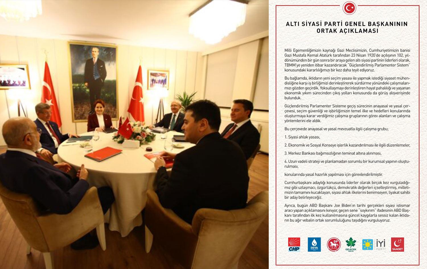 “Milli Egemenliğimizin kaynağı Gazi Meclisimizin, Cumhuriyetimizin banisi Gazi Mustafa Kemal Atatürk tarafından 23 Nisan 1920’de açılışının 102. yıldönümünden bir gün sonra bir araya gelen altı siyasi partinin liderler olarak, TBMM’ye yeniden itibar kazandıracak ‘Güçlendirilmiş Parlamenter Sistem’ konusundaki kararlılığımızı bir kez daha teyit ediyoruz.