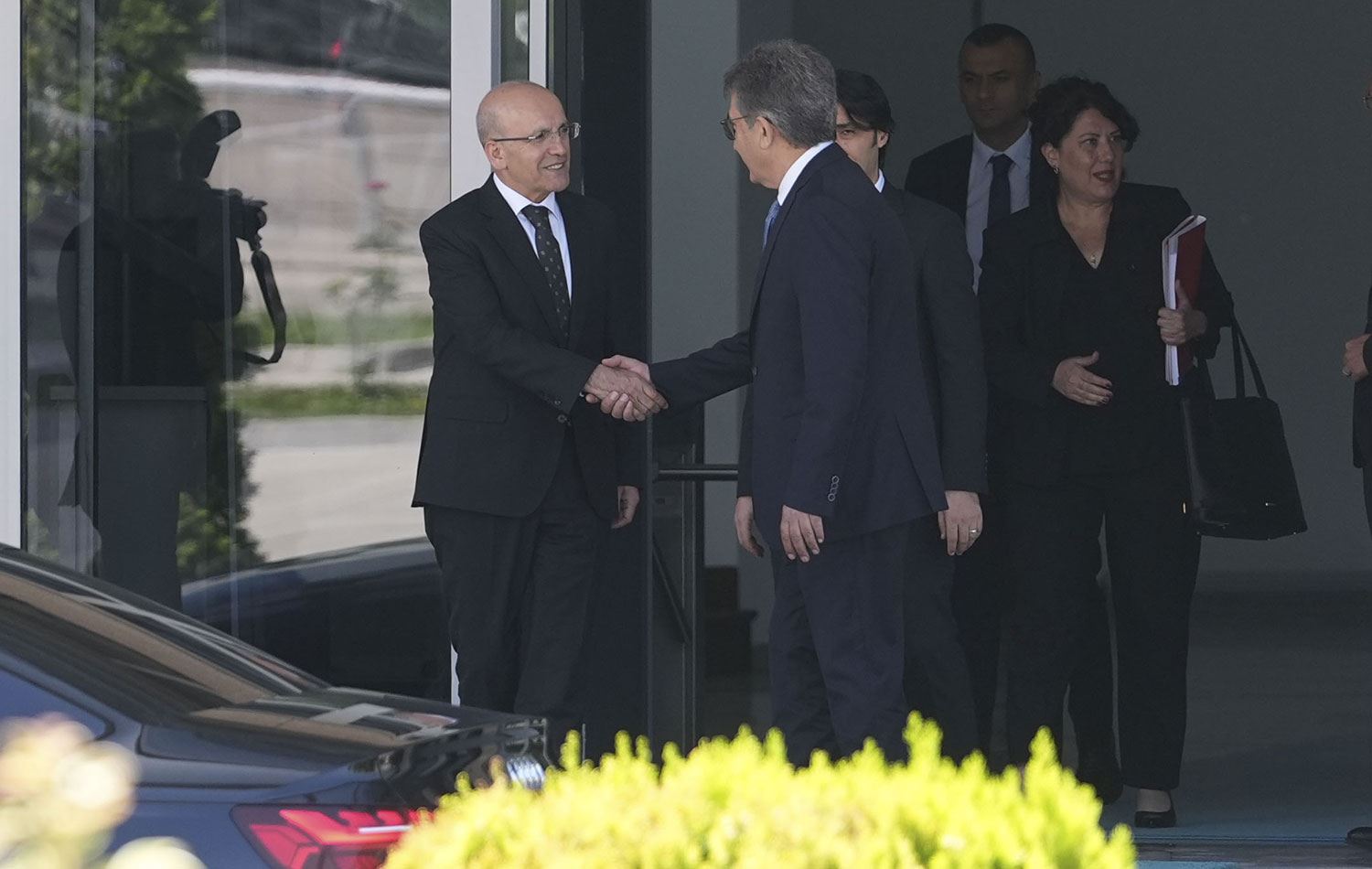 Yalçın Karatepe (sağda), Mehmet Şimşek (solda) ile makamında görüştü. Yaklaşık 4,5 saat süren görüşmenin ardından Bakan Şimşek, Karatepe'yi aracına kadar uğurladı. / AA