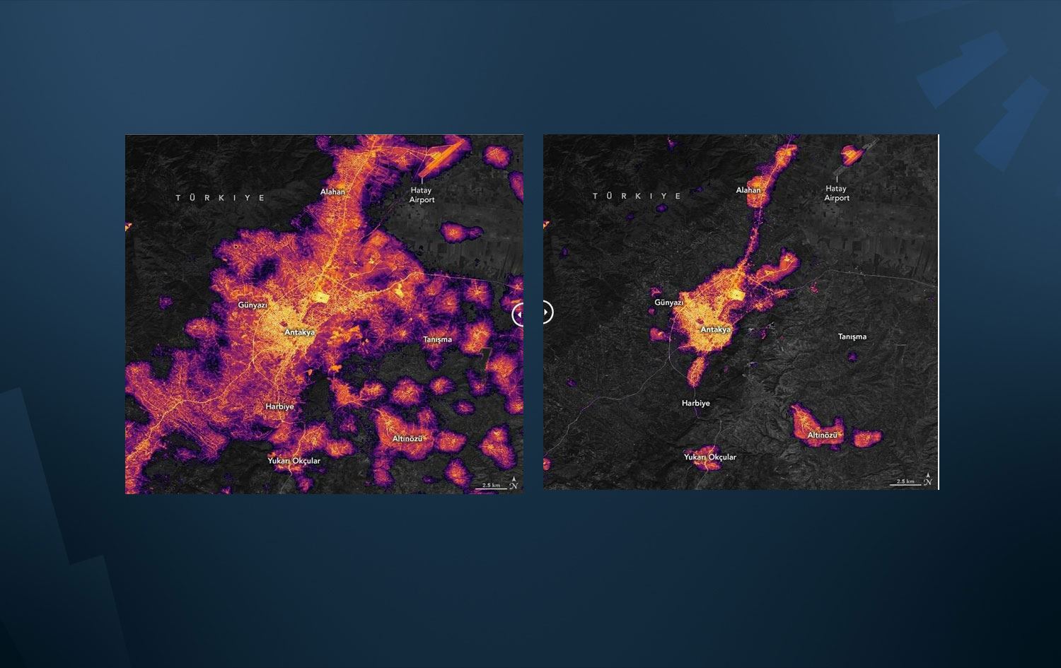 Black Marble HD ile çekilen görüntülerde Antakya’nın büyük bir kesiminin, Kahramanmaraş’ın ve Adıyaman’ın karanlıkta kaldığı aktarıldı.