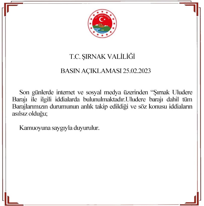 Valiliğin resmi internet sitesinde yer alan açıklamada "Son günlerde internet ve sosyal medya üzerinden Şırnak Uludere Barajı ile ilgili iddialarda bulunulmaktadır. Uludere barajı dahil tüm barajlarımızın durumunun anlık takip edildiği ve söz konusu iddiaların asılsız olduğu; kamuoyuna saygıyla duyurulur" denildi.