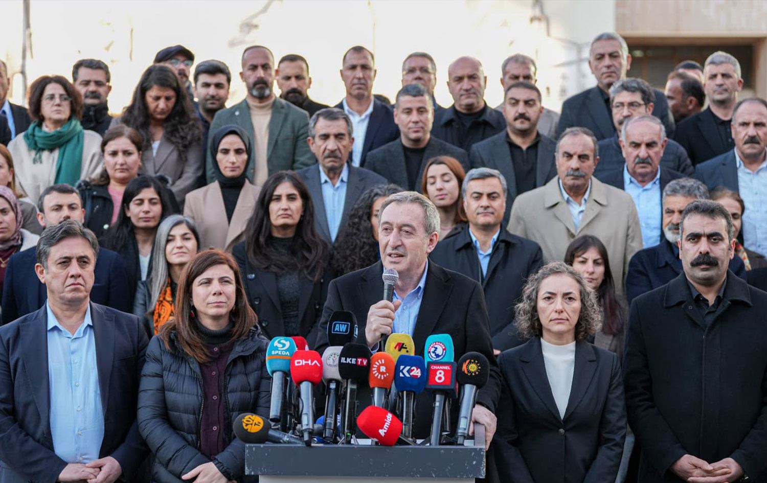 Diyarbakır Büyükşehir Belediyesi önünde gerçekleştirilen açıklamaya, DEM Partili il, ilçe belediye eşbaşkanları katıldı.
