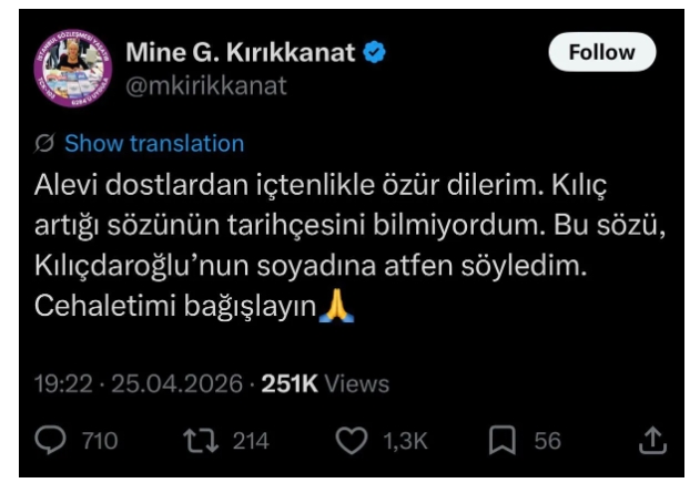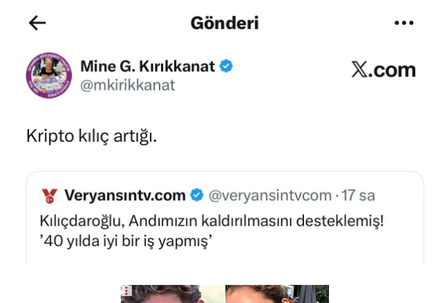 Kırıkkanat, Kılıçdaroğlu'nun Andımız’ın kaldırılmasını istediği iddia edilen bir haber paylaşımına, "kripto kılıç artığı" ifadeleriyle tepki gösterdi.