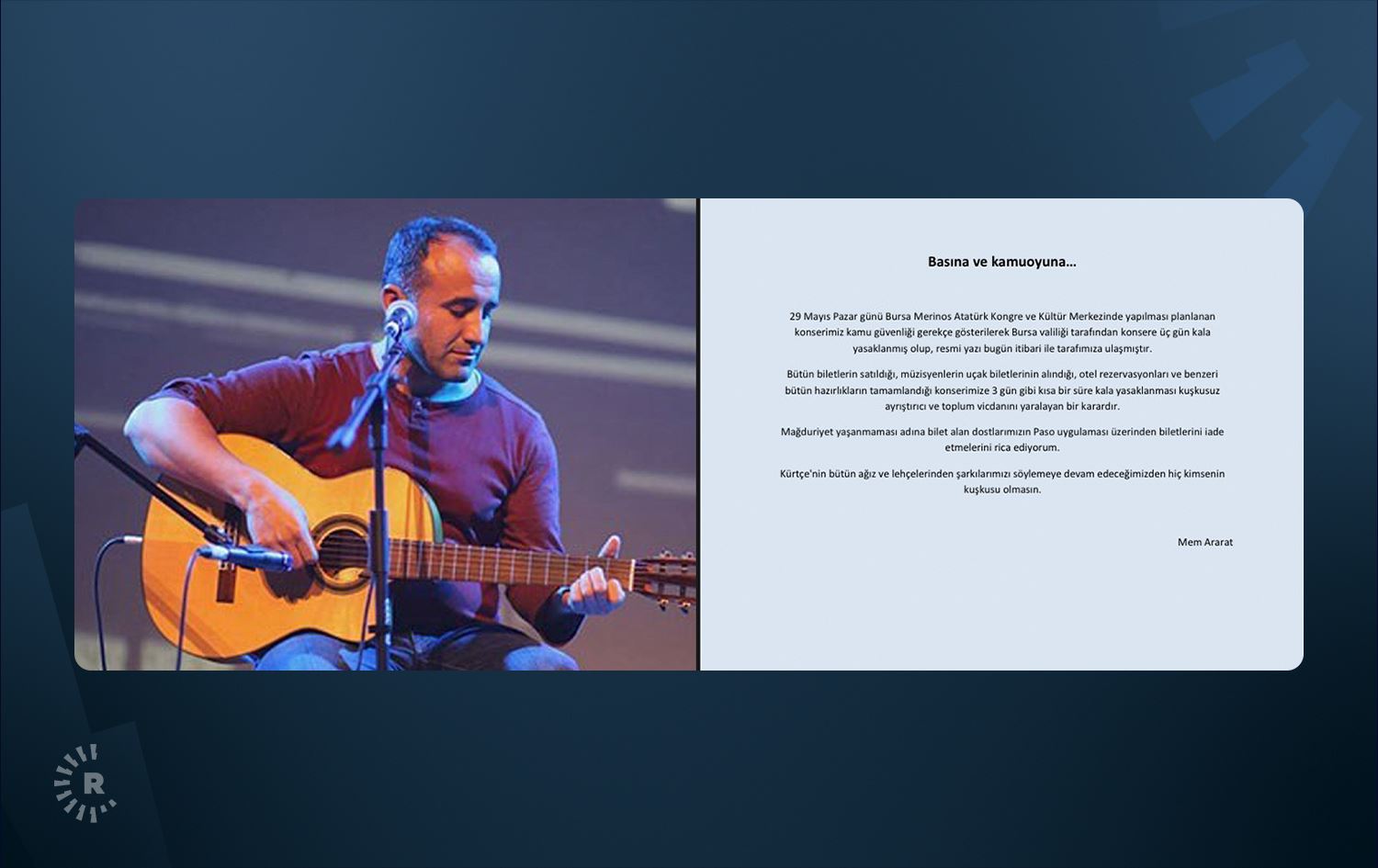 Sosyal medya hesabından bir açıklama yapan Mem Ararat, 29 Mayıs tarihinde Bursa Merinos Atatürk Kongre ve Kültür Merkezi’nde yapılması planlanan konserinin valilikçe iptal edildiğini duyurdu.