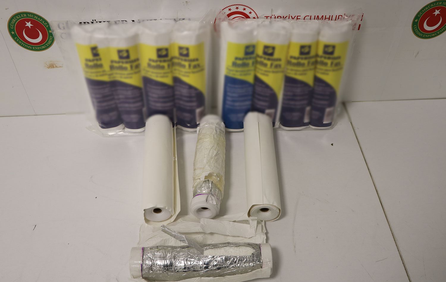 X-ray cihazında görünmesini engellemek amacıyla yazar kasa rulolarına konulan bu ruloların alüminyum ambalajlara sarıldığı ve içinde toz maddeler bulunduğu tespit edildi.