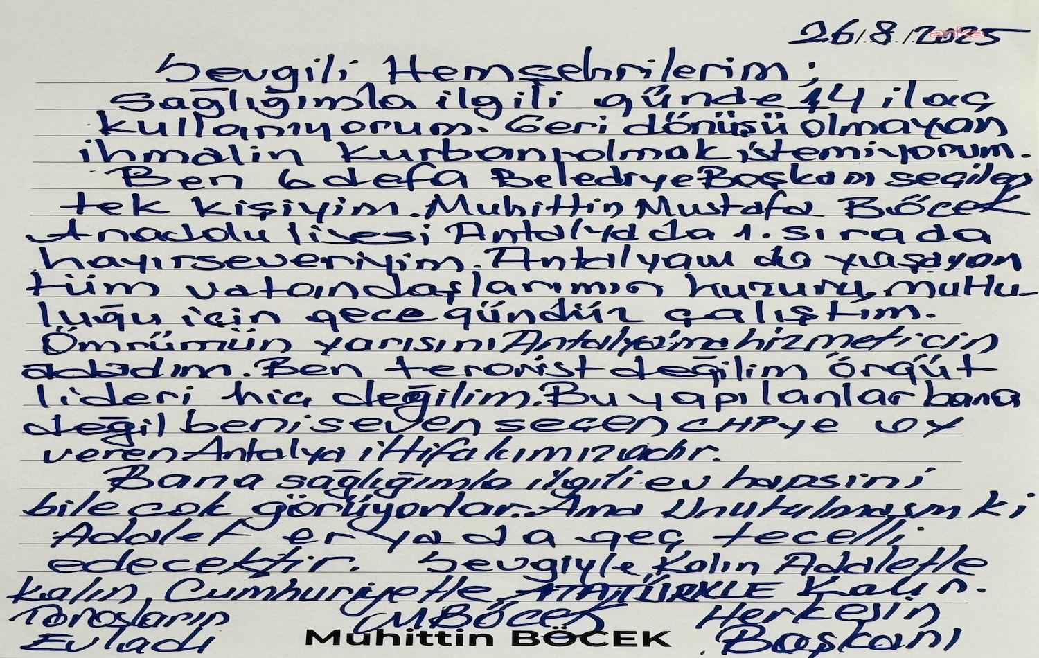 "Sevgili hemşehrilerim, sağlığımla ilgili günde 14 ilaç kullanıyorum. Geri dönüşü olmayan ihmalin kurbanı olmak istemiyorum. Ben 6 defa belediye başkanı seçilen tek kişiyim. Muhittin Mustafa Böcek Anadolu Lisesi Antalya'da 1. sırada hayırseveriyim. Antalya'mda yaşayan tüm vatandaşlarımın huzuru, mutluluğu için gece gündüz çalıştım. Ömrümün yarısını Antalya'ma hizmet için adadım. Ben terörist değilim, örgüt lideri hiç değilim. Bu yapılanlar bana değil beni seven, seçen, CHP'ye oy veren Antalya İttifakı'mızadır."