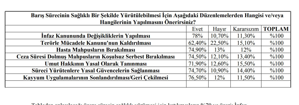 Sürecin sağlıklı yürümesi için neler yapılması gerektiği yönündeki, sorulara katılımcıların yüzde 70'i, "İnfaz Kanun'da değişiklik yapılması", "Kayyum uygulamalarına son verilmesi", "Süreci yürütenlere yasal güvenceler sağlanması", "Hasta ve süreci dolmuş mahpusların koşulsuz serbest bırakılması" ve "umut hakkına dair düzenlemenin yapılmasını" istedi.