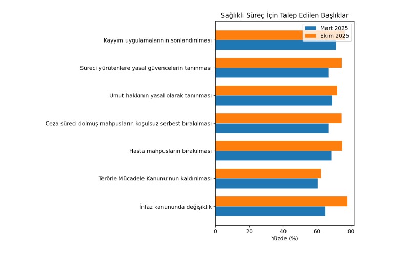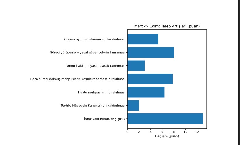 Vatandaşlara sürecin sağlıklı ilerlemesi için hangi adımların atılması gerektiği sorulduğunda, Mart ve Ekim ayları arasında tüm başlıklarda talep artışı gözlemlendi. En yüksek artış "İnfaz kanununda değişiklik" talebinde yaşandı.