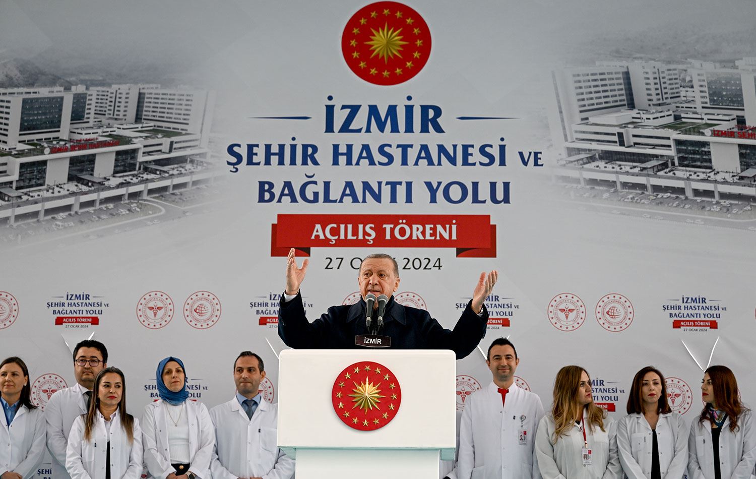 Cumhurbaşkanı Erdoğan, İzmir Bayraklı Şehir Hastanesinin açılışında konuştu. Erdoğan, "İzmir'de olduğu gibi pek çok yerde faaliyete geçen şehir hastaneleriyle sağlık hizmetlerini dünya standartlarının üstünde bir seviyeye taşıdık. Yaklaşık 310 bini doktor olmak üzere 1,5 milyona yakın sağlık çalışanıyla bu alandaki insan kaynağımızı güçlendirdik. Önümüzdeki ay kamuya 15 bini hemşire olmak üzere 35 bin sağlık personeli daha alıyoruz. Ülke genelinde 2,5 milyon kişiye evde sağlık hizmeti vererek hizmeti insanımızın ayağına götürdük” dedi.