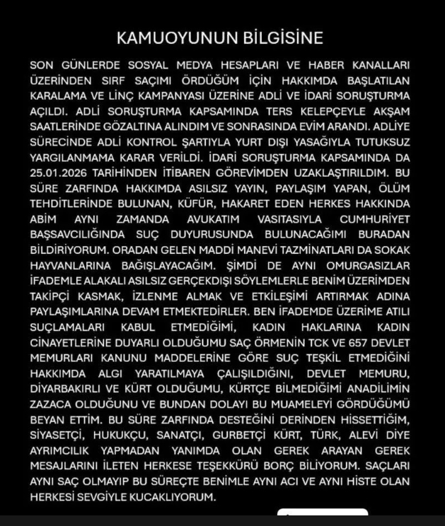 “Son günlerde sosyal medya hesapları ve haber kanalları üzerinden sırf saçımı ördüğüm için hakkımda başlatılan karalama ve linç kampanyası üzerine adli ve idari soruşturma açıldı. Adli soruşturma kapsamında ters kelepçeyle akşam saatlerinde gözaltına alındım ve sonrasında evim arandı. Adliye sürecinde adli kontrol şartıyla yurt dışı yasağıyla tutuksuz yargılanmama karar verildi. İdari soruşturma kapsamında da 25.01.2026 tarihinden itibaren görevimden uzaklaştırıldım.