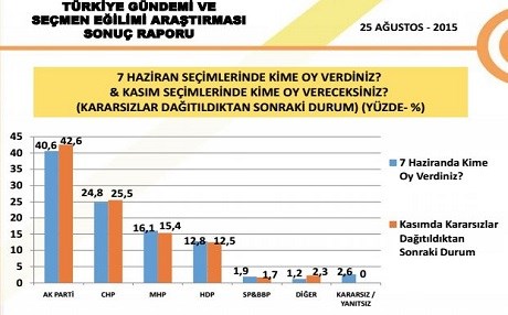 "Kasım 2015 seçimlerinde kime oy vereceksiniz?"sorusuna katılımcıların yüzde 42.6'sı AK Parti yanıtını verirken, CHP diyenlerin oranı yüzde 25.5, MHP diyenlerin oranı yüzde 15.4 oldu. 7 Haziran seçimlerinde yüzde 13 oy alan HDP'nin oy oranı ise yüzde 12.5'e geriledi.