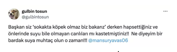 Yavaş'ı etiketleyen Tosun X hesabından yaptığı paylaşımda, "Başkan siz 'Sokakta köpek olmaz, biz bakarız' derken hapsettiğiniz ve önlerinde suyu bile olmayan canlıları mı kastetmiştiniz! Ne diyeyim bir bardak suya muhtaç olun o zaman!" dedi.