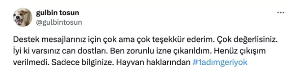 "Destek mesajlarınız için çok ama çok teşekkür ederim. Çok değerlisiniz. İyi ki varsınız can dostları. Ben zorunlu izne çıkarıldım. Henüz çıkışım verilmedi. Sadece bilginize. Hayvan haklarından bir adım geri yok."