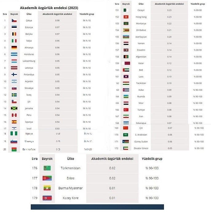 Euronews'de yer alan habere göre; Akademik Özgürlük Endeksi 2023 raporu Aralık 2022 durumunu yansıtıyor. Buna göre Türkiye’nin 2022 puanı 0,084. Türkiye bu puan ile 179 ülke arasında 166. sırada yer alıyor.