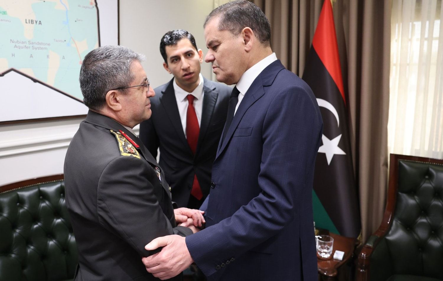 Libya Başbakanı Abdulhamid Dibeybe (ortada), Ankara'da düşen uçakta hayatlarını kaybeden Libya askeri heyeti için taziye ziyaretinde bulunmak üzere Trablus'a giden Türkiye Genelkurmay Başkanı Orgeneral Selçuk Bayraktaroğlu'nu (solda) kabul etti. / Foto: AA