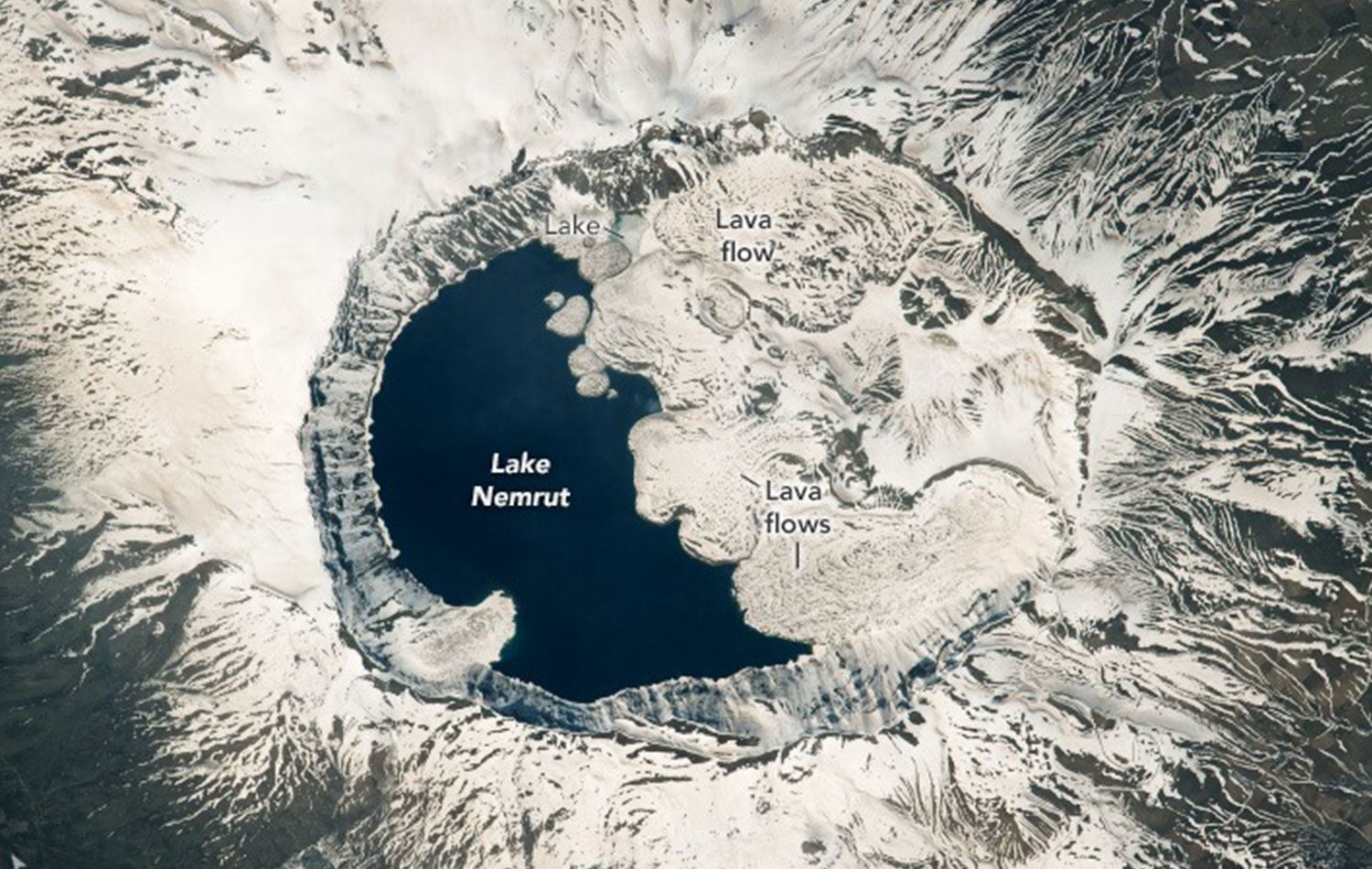 NASA’nın resmi X hesabından, “Harika bir kaldera. Türkiye'deki Nemrut Dağı'nın karla kaplı kalderasının bu fotoğrafını bir @Space_Station astronotu çekti. Kalderanın doğu yarısı geçmiş patlamalardan kaynaklanan katılaşmış lav akıntılarına sahiptir. Nemrut Gölü'nü besleyen kaplıcalar batı yarısına akıyor” notuyla paylaşılan fotoğraf çok sayıda beğeni aldı.