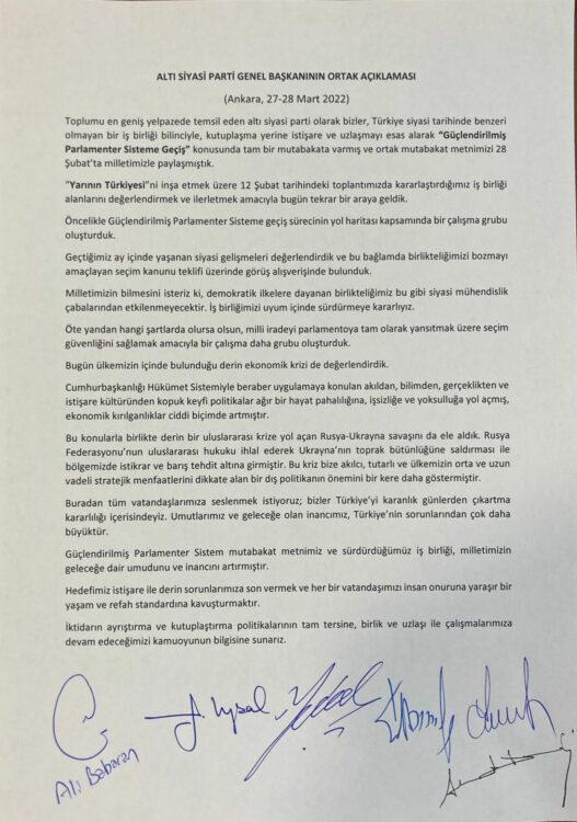 "Toplumu en geniş yelpazede temsil eden altı siyasi parti olarak bizler, Türkiye siyasi tarihinde benzeri olmayan bir iş birliği bilinciyle, kutuplaşma yerine istişare ve uzlaşmayı esas alarak 'Güçlendirilmiş Parlamenter Sisteme Geçiş' konusunda tam bir mutabakata varmış ve ortak mutabakat metnimizi 28 Şubat’ta milletimizle paylaşmıştık.