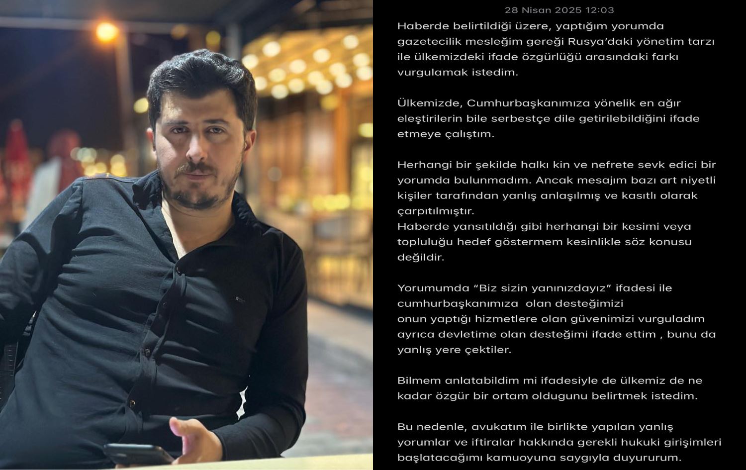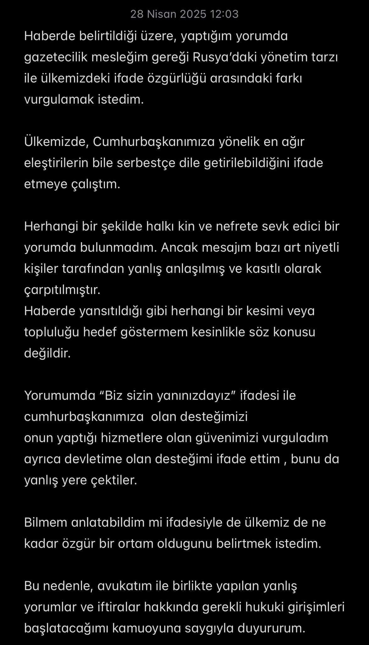 “Gazetecilik mesleğimin gereği olarak yaptığım yorumda, Rusya’daki yönetim anlayışı ile ülkemizdeki ifade özgürlüğü arasındaki farkı vurgulamayı amaçladım. Ülkemizde, Cumhurbaşkanımıza yönelik en ağır eleştirilerin dahi özgürce dile getirilebildiğini ifade etmeye çalıştım.