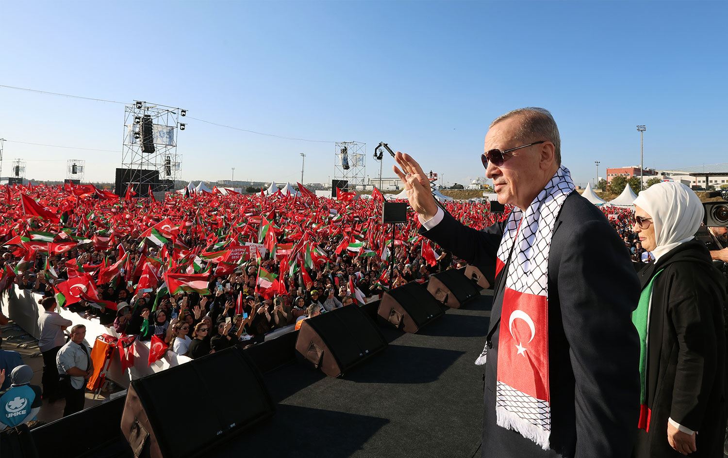 Haber Merkezi – Büyük Filistin Mitingi''nde konuşan Türkiye Cumhurbaşkanı Recep Tayyip Erdoğan, ''Bugün Gazze için yüreklerimizin yangınını cümle aleme haykıracağız. Gazze için kıyamdayız'' dedi. Erdoğan “Gazze'de yaşanan katliam topyekün Batı'nın eseridir” diyerek İsrail’in savaş suçu işlediğini kaydetti.