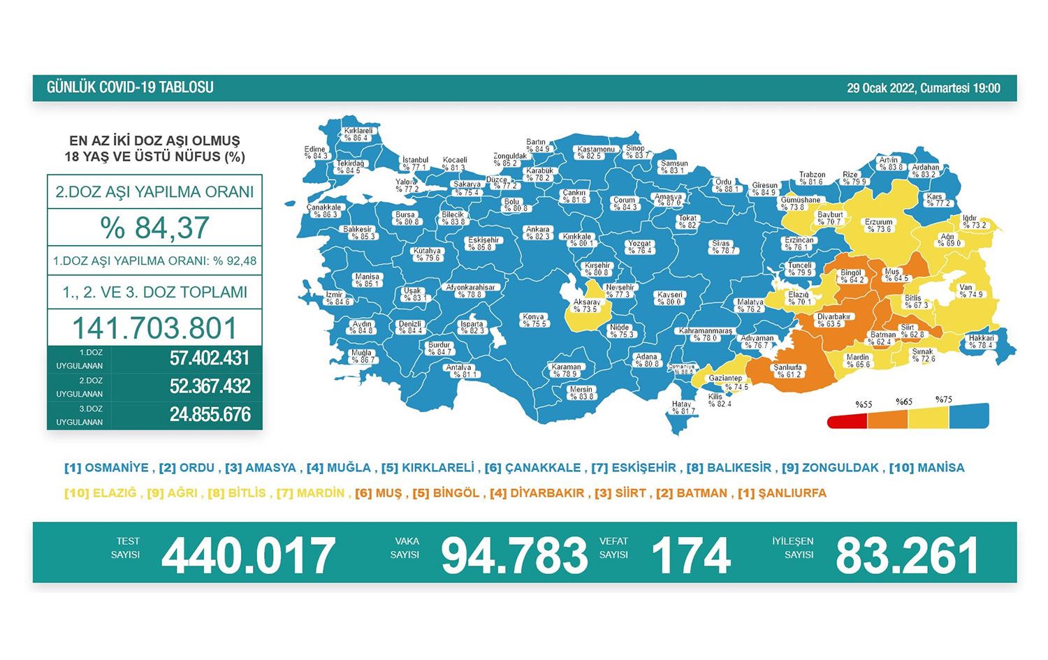Haber Merkezi – Türkiye'de son 24 saatte 440 bin 17 Kovid-19 testi yapıldı, 94 bin 783 kişinin testi pozitif çıktı, 174 kişi yaşamını yitirdi.