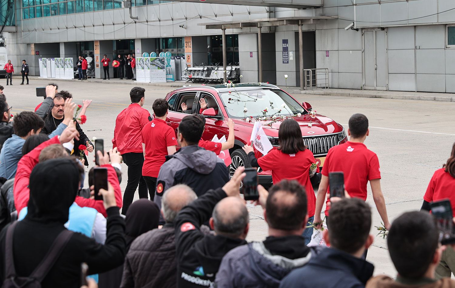 Erdoğan çifti alana Türkiye’nim yerli üretim otomobili olan TOGG ile geldi.