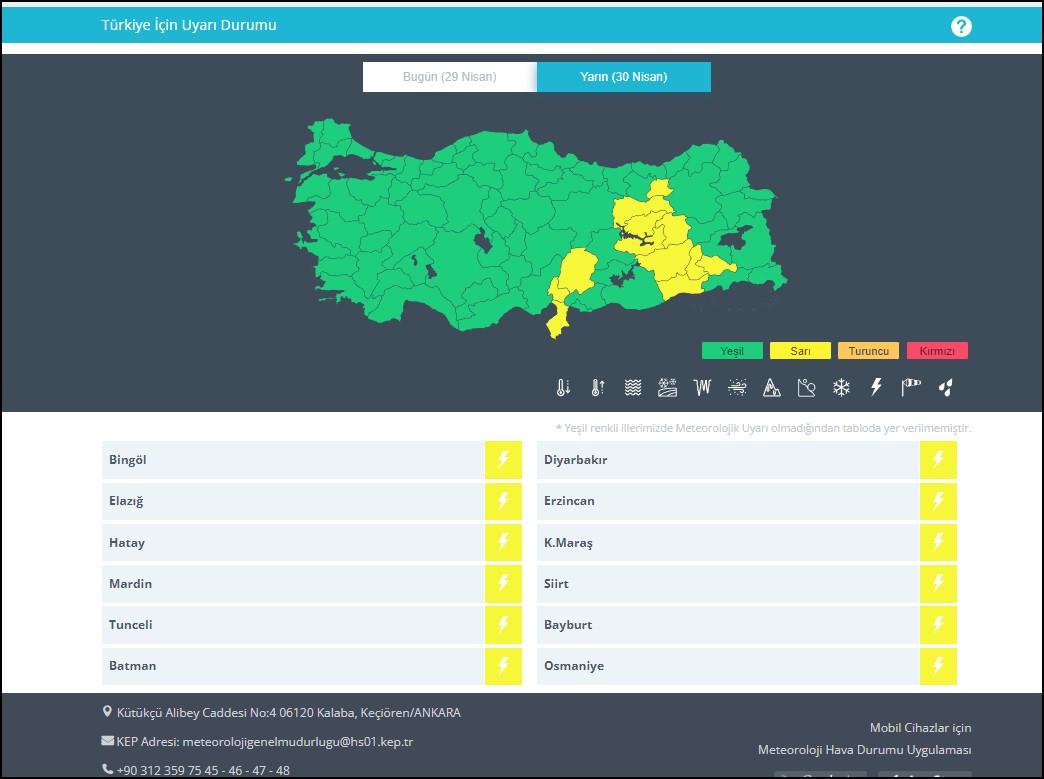 Haber Merkezi – Bayburt, Erzincan, Dersim, Elazığ, Bingöl, Diyarbakır, Batman, Siirt çevreleri ile Mardin'in doğu kesimleri için kuvvetli yağış uyarısı yapıldı.