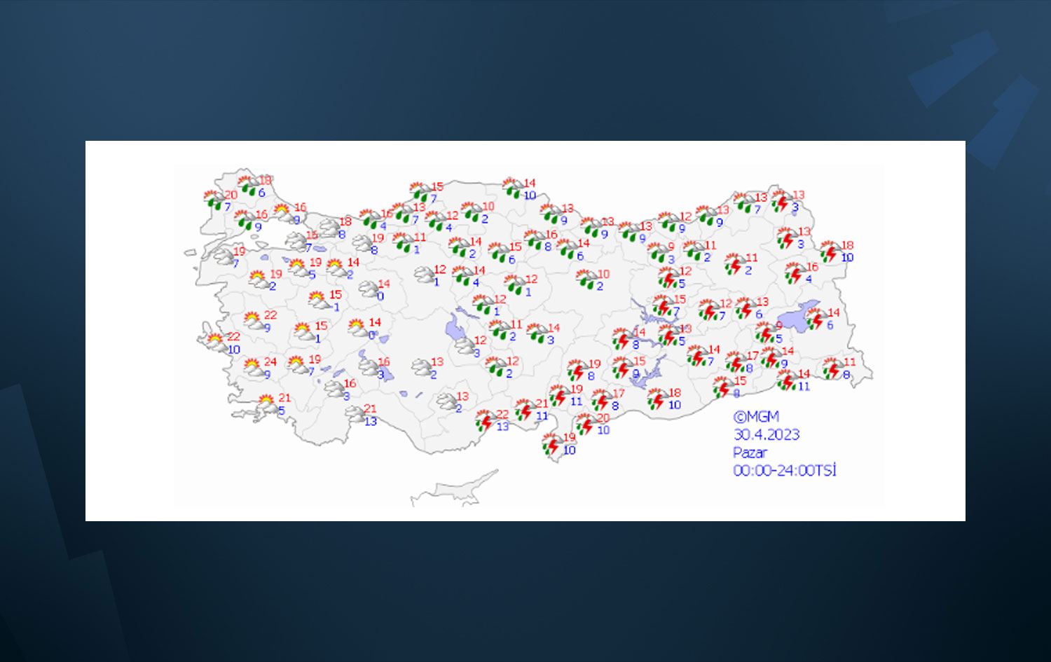 Meteoroloji Genel Müdürlüğünden yapılan açıklamaya göre, sağanak ve gök gürültülü sağanağın, Bayburt, Erzincan, Dersim, Elazığ, Bingöl, Diyarbakır, Batman, Siirt çevreleri ile Mardin'in doğu kesimlerinde yerel olmak üzere kuvvetli (21-50 kilogram/metrekare) olması bekleniyor.