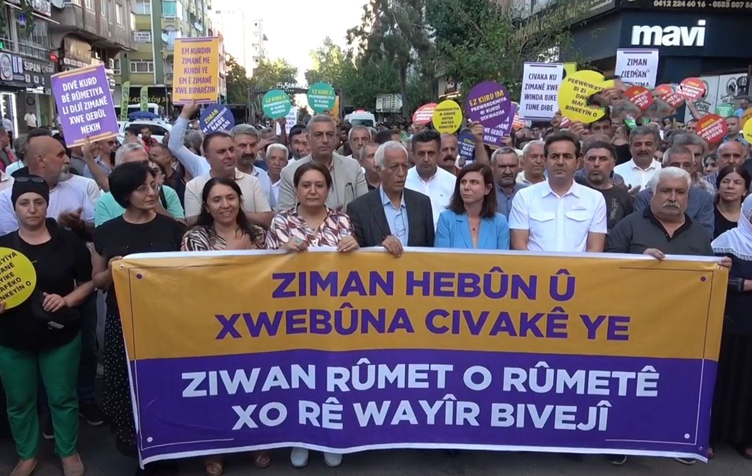 Yenişehir ilçesindeki Yaşar Kemal Caddesi’nde bir araya gelen, aralarında Diyarbakır Büyükşehir Belediyesi Eş Başkanı Ayşe Serra Bucak Küçük ve DEM Parti Van Milletvekili Sinan Çiftyürek’in de bulunduğu grup, Kürtçe yazının silindiği Gevran Caddesi’nde yürüdü.