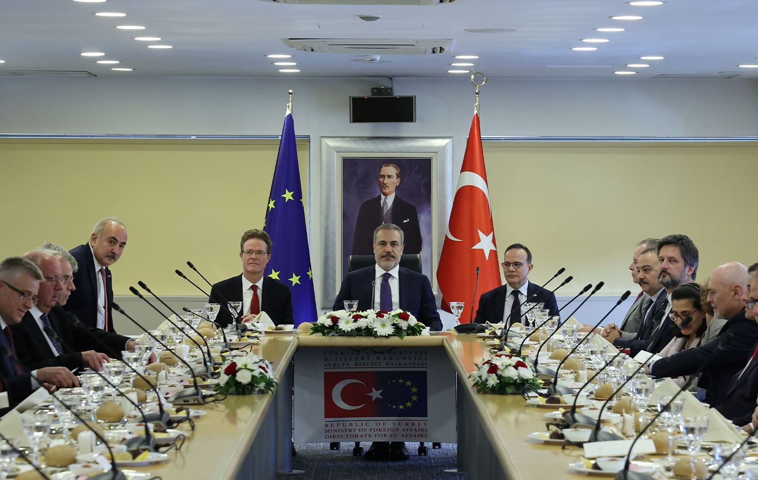 Bakan Fidan, Avrupa Birliği (AB) Türkiye Delegasyonu Başkanı Büyükelçi Nikolaus Meyer-Landrut ve AB üyesi ülkelerin Ankara büyükelçilerini Dışişleri Bakanlığına bağlı AB Başkanlığı binasında kabul etti.