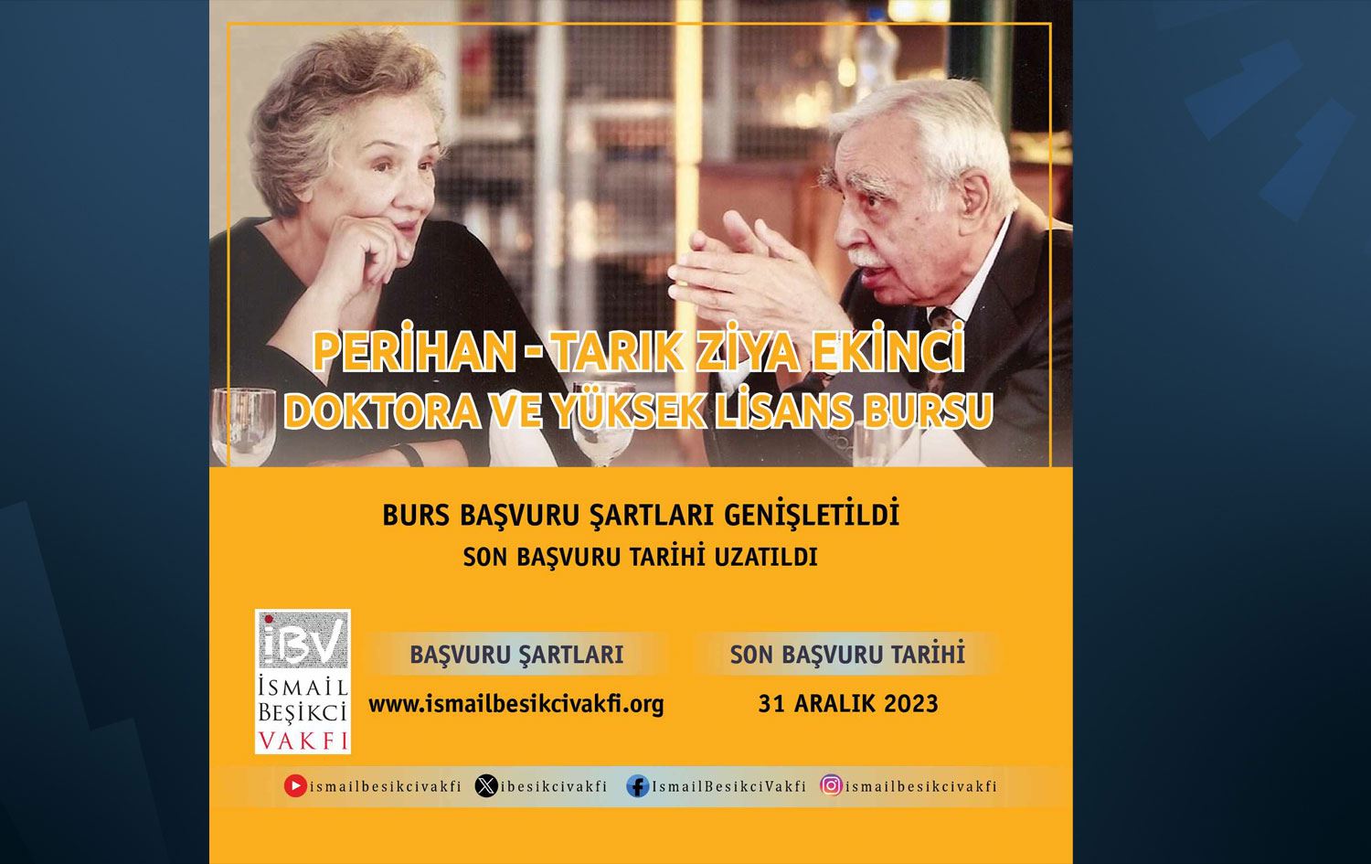 İBV’den yapılan açıklamada “Daha önce sadece Doktora öğrencilerini kapsayan burs başvurularımıza Yüksek Lisans öğrencileri de dahil edilerek başvuru şartlarımız genişletilmiş ve son başvuru tarihi 31 Aralık 2023'e uzatılmıştır” ifadelerine yer verildi.