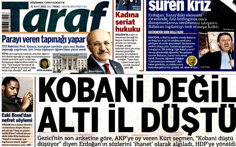 “2014 seçimlerini en yakın tahminle bilen Gezici Araştırma Şirketi, 14-15 Mart tarihlerinde, altı büyükşehirde, 24 bin 868 kişiyle görüştü. Buna göre AKP, Suriye politikası ve Erdoğan’ın Kobani sözleri nedeniyle Antalya, Mersin, Adana, Antep, Hatay ve Şanlıurfa’da hızla oy kaybetti.