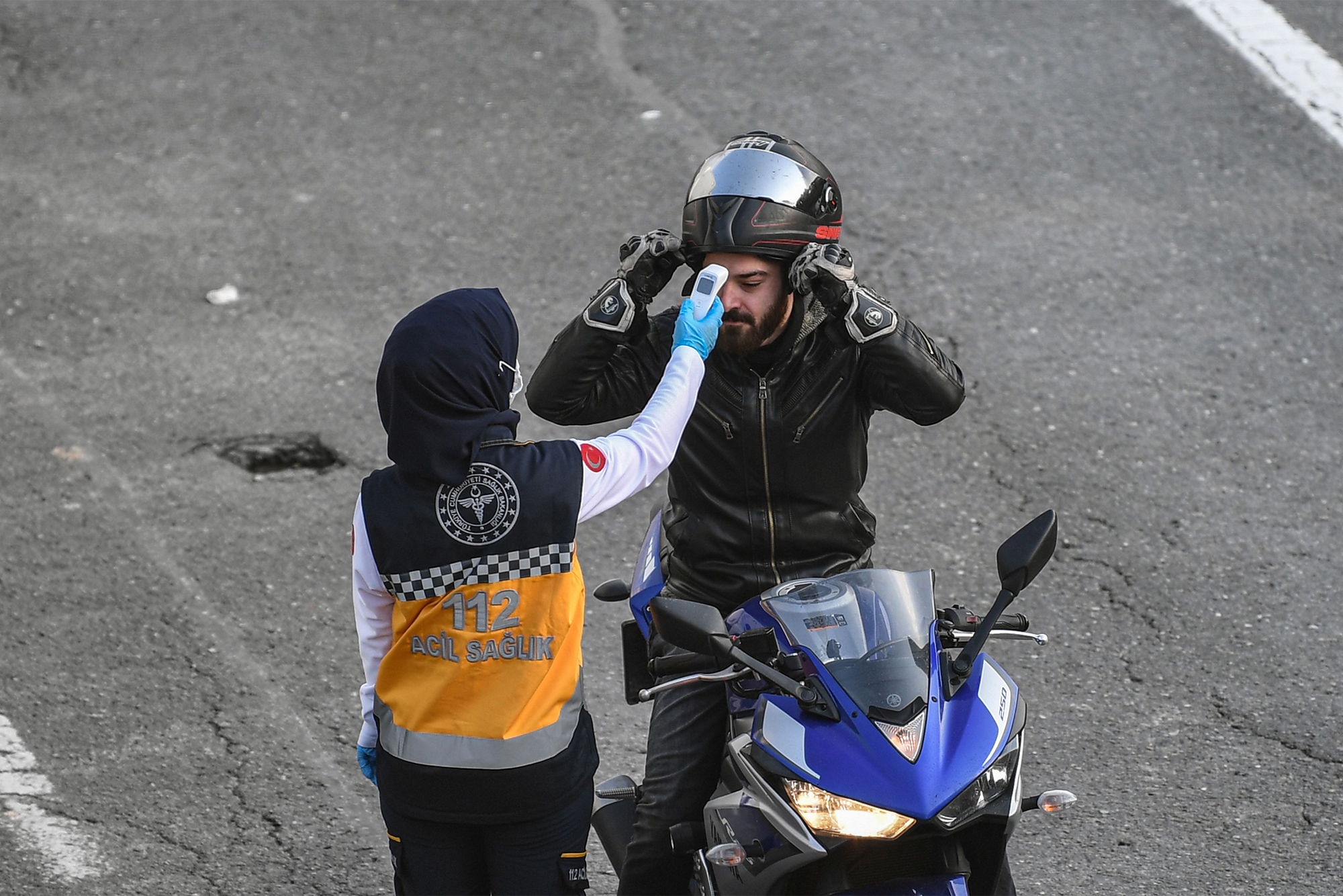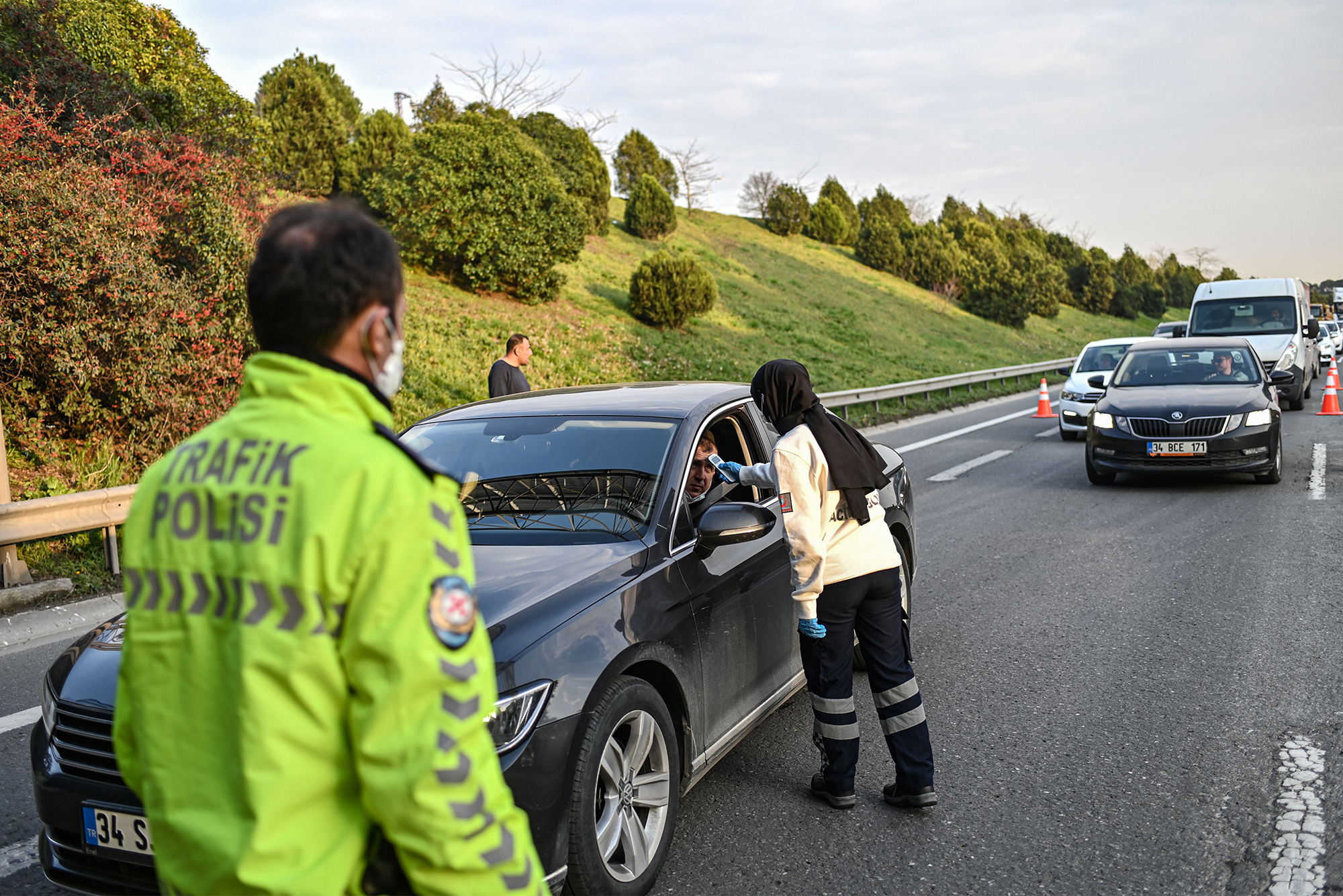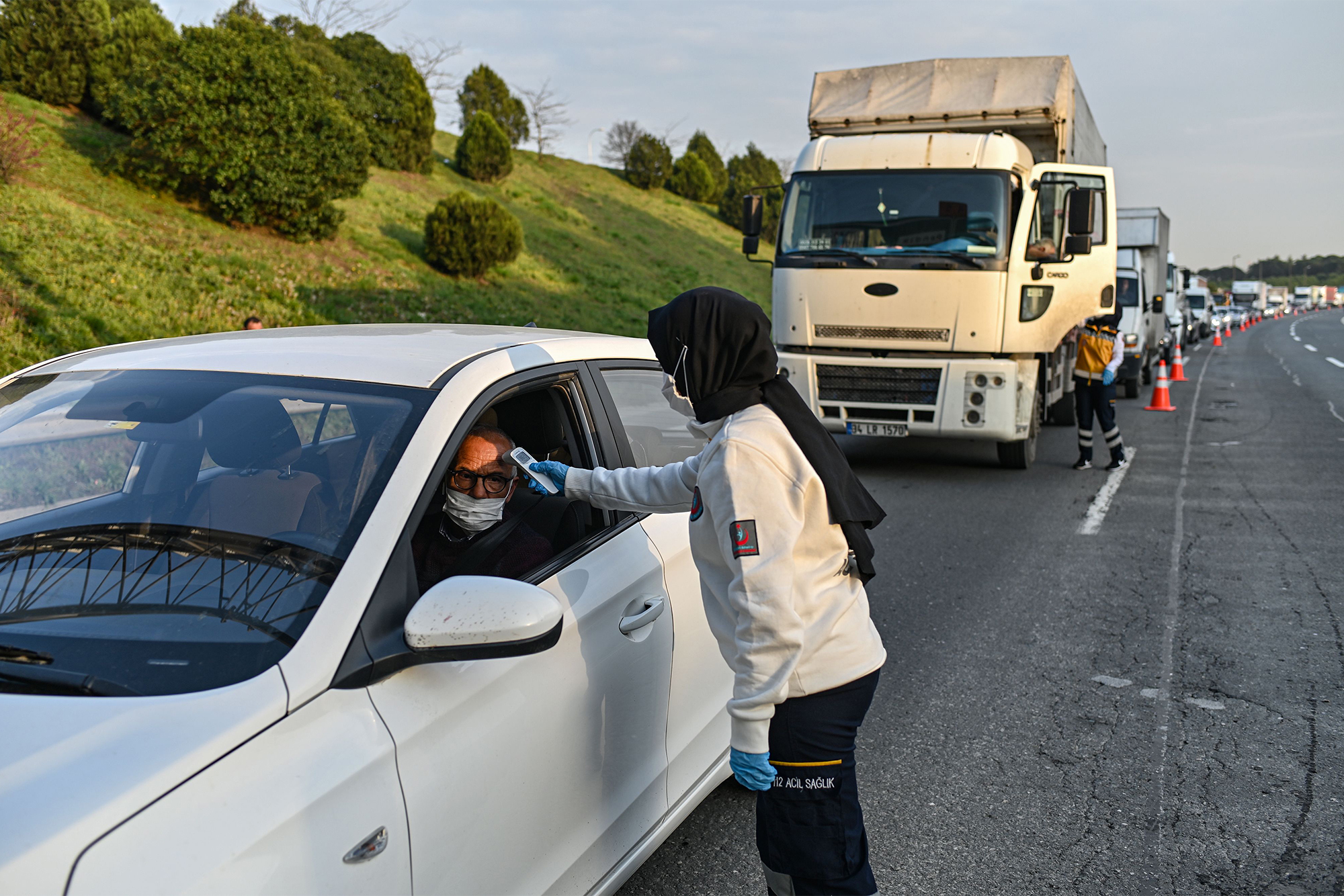 (AFP) - İstanbul'da yeni tip koronavirüs (Covid-19) tedbirleri kapsamında, kentin giriş ile çıkış noktalarında sürücülere ve yolculara ateş ölçümü yapılıyor.