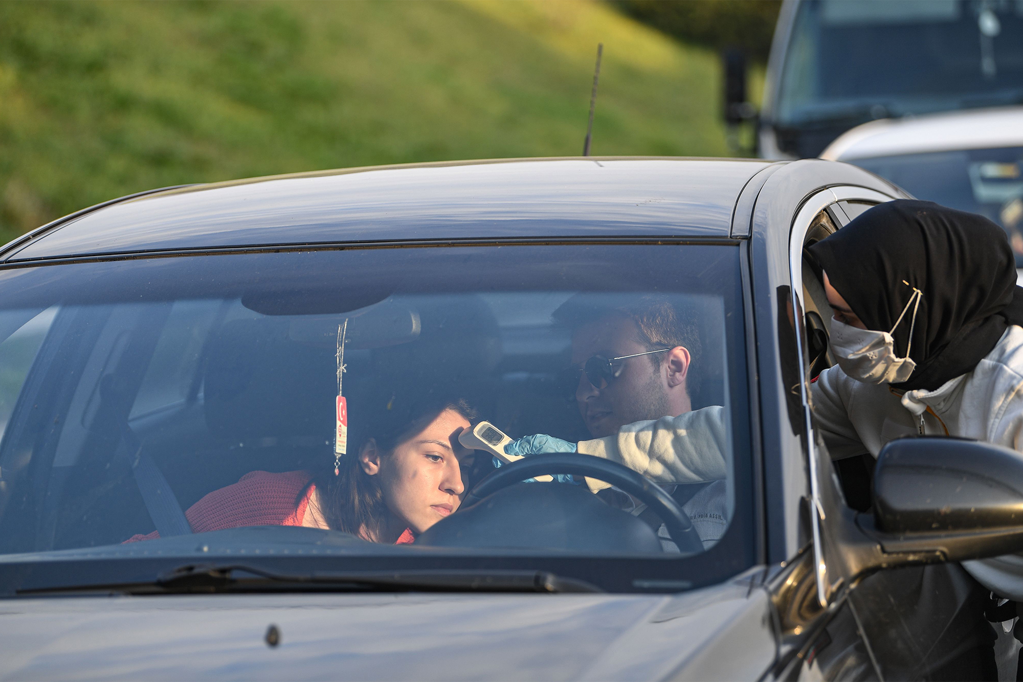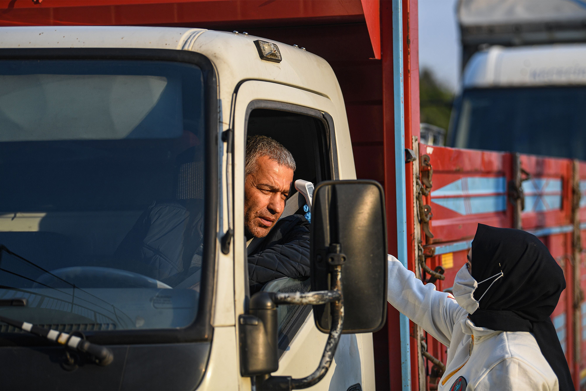 Denetim noktalarında, Covid-19'un en önemli belirtilerinden olan ateşi tespit etmek için yolcu ve sürücülerin ateşi ölçülüyor.