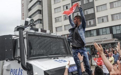 Yüksekdağ’ın konuşması sırasında mitingi protesto etmek isteyen yaklaşık 500 kişilik grup, ellerinde Türk bayrakları ile alana girmek istedi.