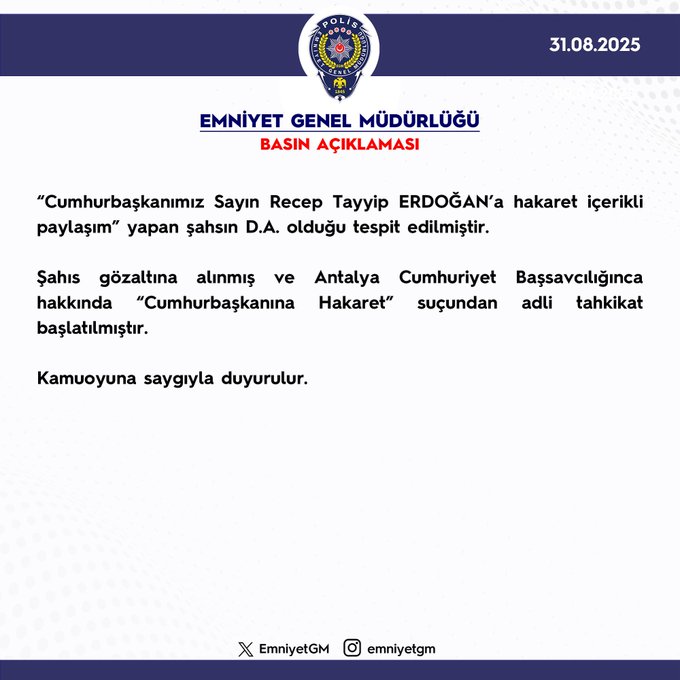 EGM'den yapılan açıklamada, Erdoğan'a hakaret içerikli paylaşım yapan kişinin D.A. olduğunun tespit edildiği belirtildi.