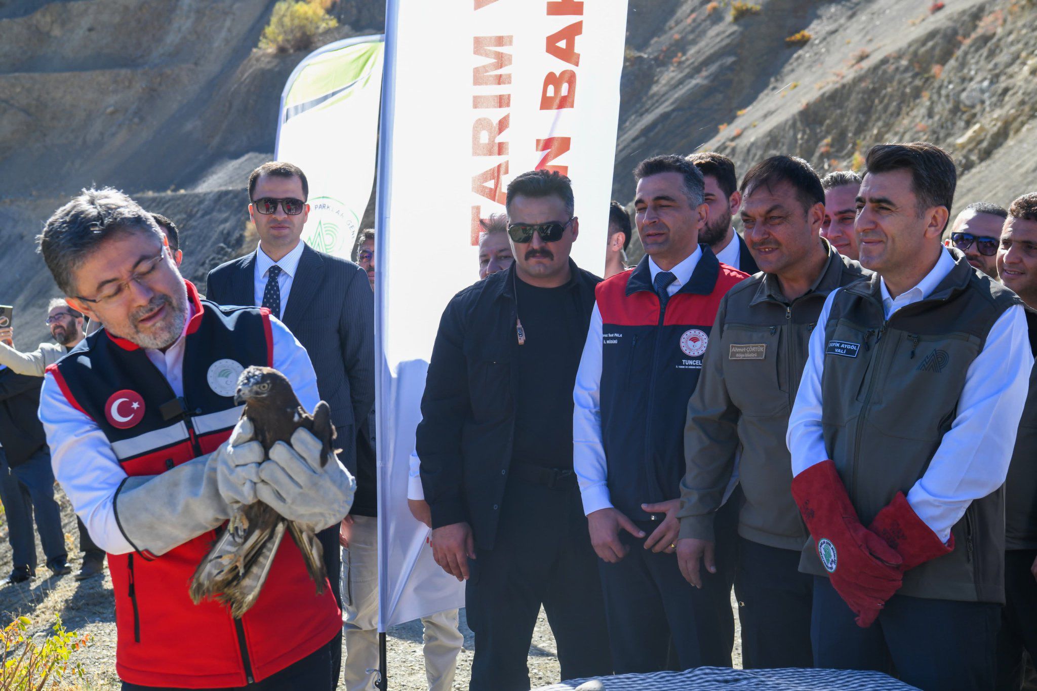 Türkiye Tarım ve Orman Bakanı İbrahim Yumaklı, Dersim programı kapsamında yaralı halde bulunup tedavisi tamamlanan kızıl şahin, dağ keçisi ve puhu kuşunun tekrar doğal ortamına salınmasına ilişkin düzenlenen törene katıldı.