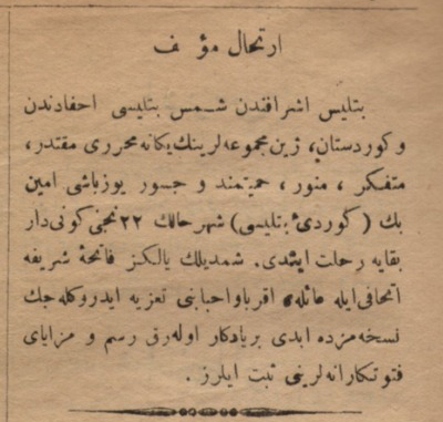 [5] Kurdîyê Bitlîsî, Kürdçeye Dair (Kürdçe Üzerine), Jîn, sayı: 14, 21 Mart 1335 (21 Mart 1919)