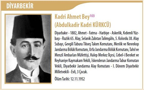 1920-1927 yılları arasında meclisin ilk döneminde Diyarbekir, ikinci döneminde ise Siverek mebusluğu yapmış bu zatın albümde iki biyografisi var. İki biyografi arasındaki tek fark ise ikincisine eklenen binbaşılık rütbesi. Kadri Ahmet Kürkcü, babasının görevi sebebiyle Diyarbekir’de doğmuş ve asker olarak yetiştirilmiş. 1919’da da kıdemli yüzbaşı olarak Diyarbekir Jandarma Alayı’na gönderilmiş. Bu görevdeyken de meclise vekil olarak atanmış.