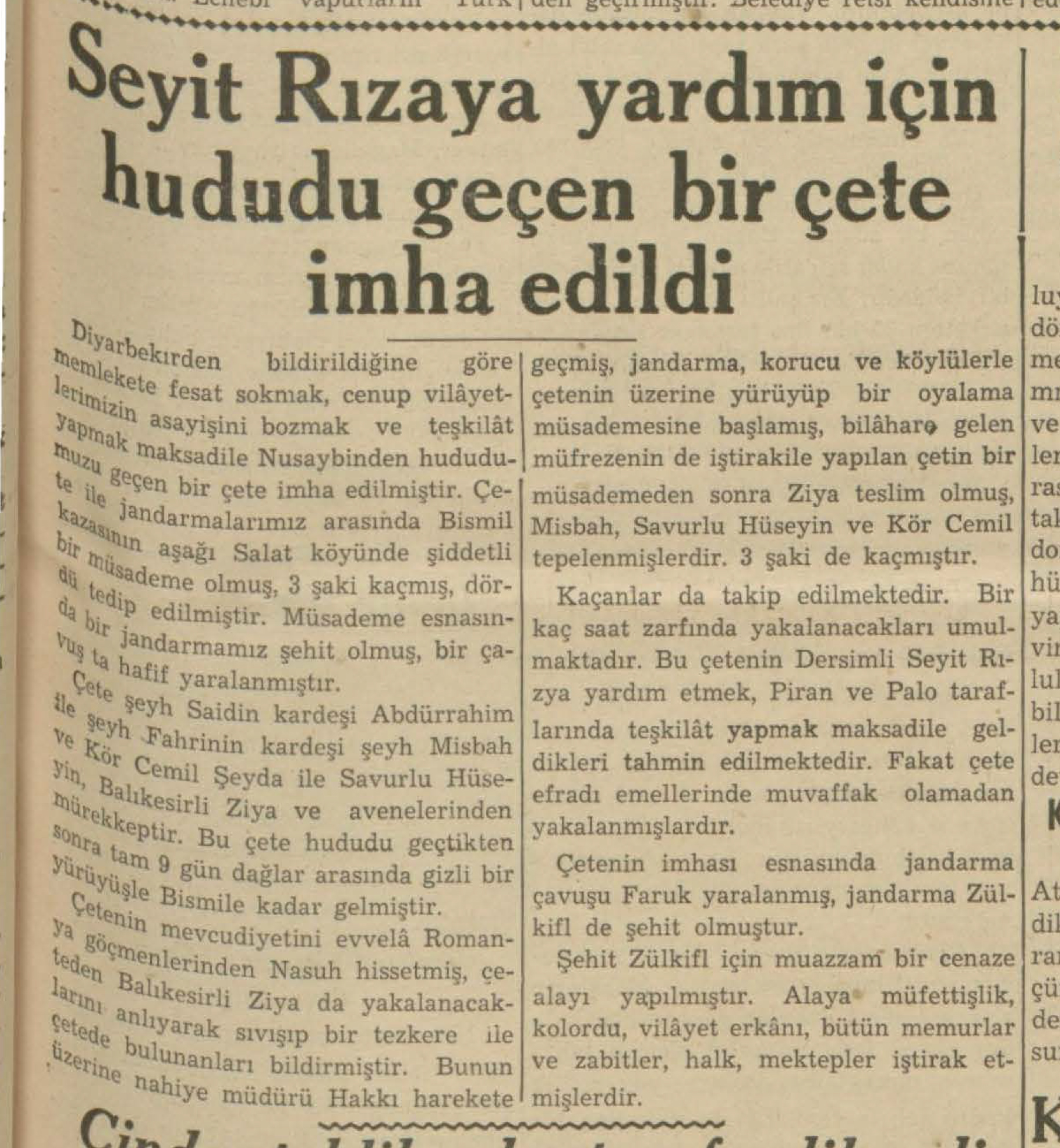 O zamanın gazetelerinden birinin aktardığına göre; bunlardan dört kişi öldürülmüş ve üç kişi kaçmış. Aşağı Salat köyü bölgesindeki çatışmada Faruk isimli çavuş yaralanmış ve Zülküf isimli bir jandarma da öldürülmüş. Bu operasyonda görevlendirilmiş idari ve askeri personel ise; Diyarbakır Vali vekili Kazım Demirer, müfreze komutanı Binbaşı Hamdi, Merkez bölük komutanı Yüzbaşı Hulusi, Bismil Jandarma komutanı Yüzbaşı Salih, Sinan nahiye müdürü Hakkı Bey, Diyarbakır Merkez Karakol komutanı Faruk, Göçmen Nasuh, jandarma ve köy milisleri yer almıştır.[6]