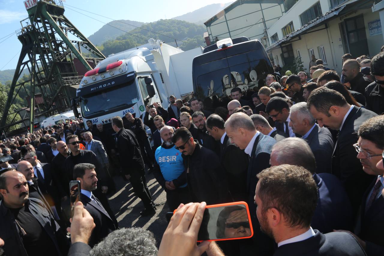 Gece boyu “Şehitlik” şeklinde tarif edilen durum ertesi gün Erdoğan geldiği saatlerde ise artık hem etrafımızdaki gazeteciler tarafından, hem kurtarmacılar ve hem de diğer kalabalık tarafından kanıksanmış oluyor. Erdoğan yüksek bir devlet ciddiyeti ricali ile Maden sahasına geliyor. Önce, akşamdan hazırlanan TIR’ın içinde bakanlardan brifig alıyor, o arada hitap düzeni ve devlet protokolü pozisyonu alınıyor, bütün kanallar buna hazır ve mikrofonlar toplanıp kürsüye bırakıldıktan sonra, açıklamayı bariyerlerin önünde yani Erdoğan’ın yakınında istenen muhabirler oraya alınıyor.