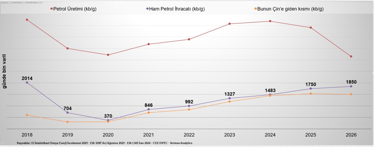 2026 yılının başında ise savaş öncesi dönemde üretim yaklaşık 3,1 milyon varil seviyesinde bulunuyor ve bunun yaklaşık 1,85 milyon varili, büyük ölçüde Çin’e olmak üzere ihraç ediliyordu.