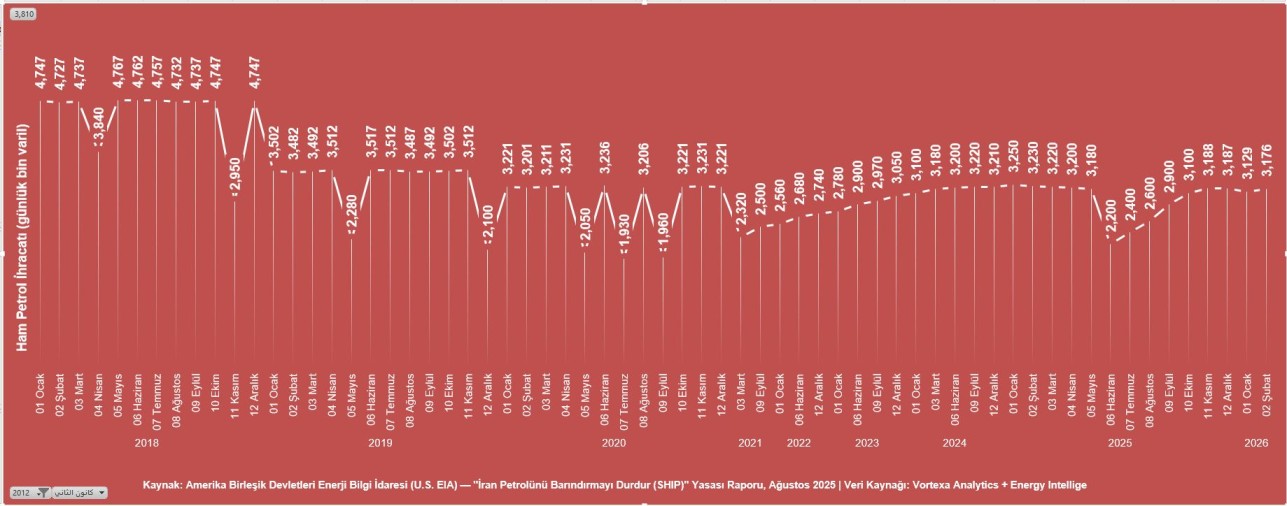 Grafik 1: İran'ın petrol üretimi 2018 - şubat 2026