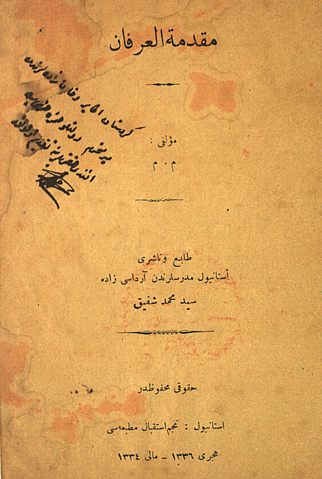 [1] M. M., Muqeddimet’ûl İrfan, Naşiri: Arvasizade Seyyid Mehmed Şefik, Necmî İstikbal Matbaası, İstanbul, Hicri 1336-Mali 1334 (1918)