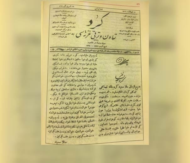Kürt Teavün ve Terakki Gazetesi'nin 5-12-1908 tarihli yedinci sayısında bizzat kendi Kürtçesi ile yazdığı bu yazı, bu alimin has bir Kürt olduğunu, halkına ve ülkesine sahip çıktığını göstermektedir.