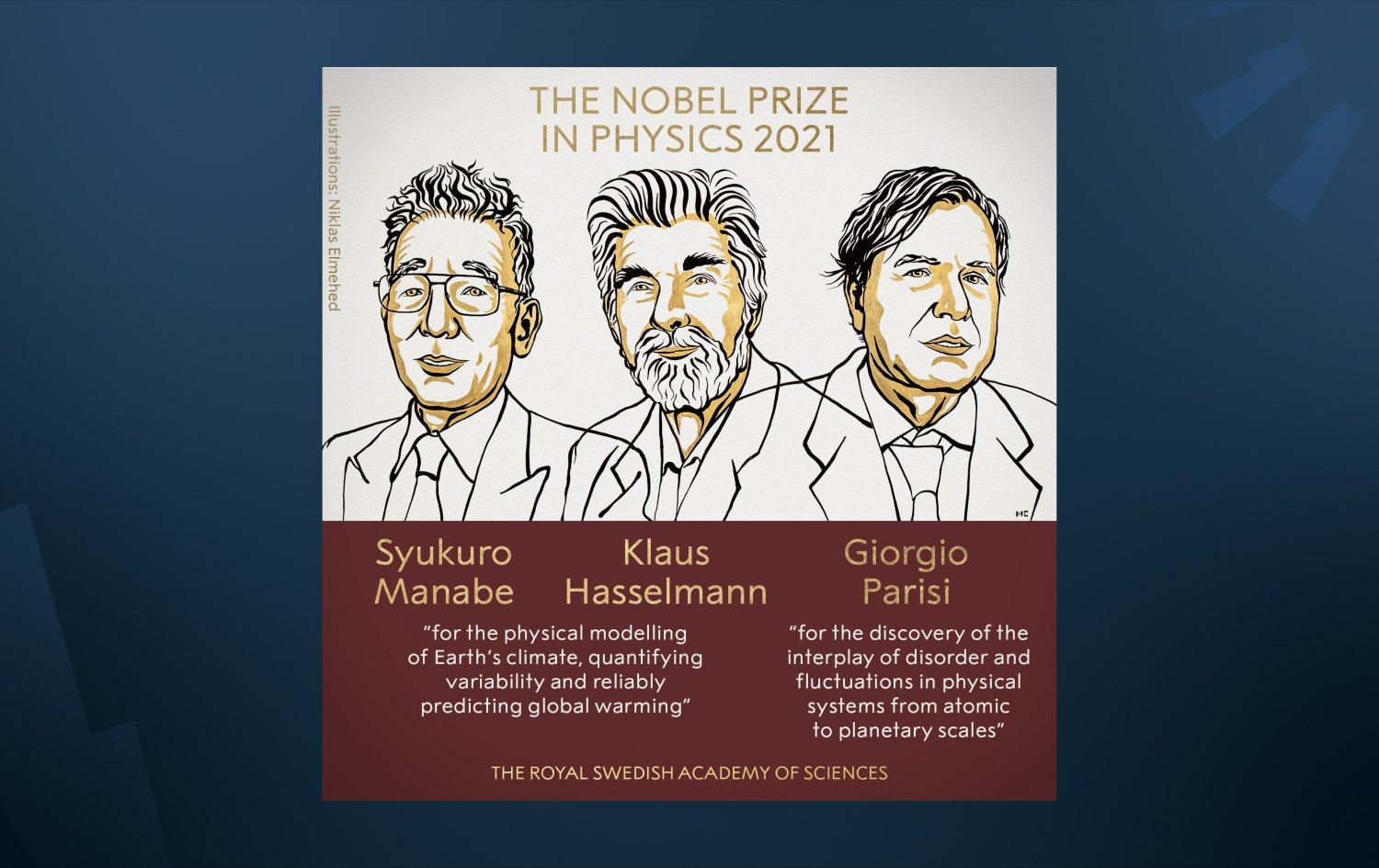 İsveç Kraliyet Bilimler Akademisi'nde düzenlenen basın toplantısında, bu yılki ödülün bir yarısının Japon meteorolog ve klimatolog Manabe ile Alman oşinograf ve iklim modelleyicisi Hasselmann'a, diğer yarısının da İtalyan teorik fizikçi Parisi'ye layık görüldüğü açıklandı.