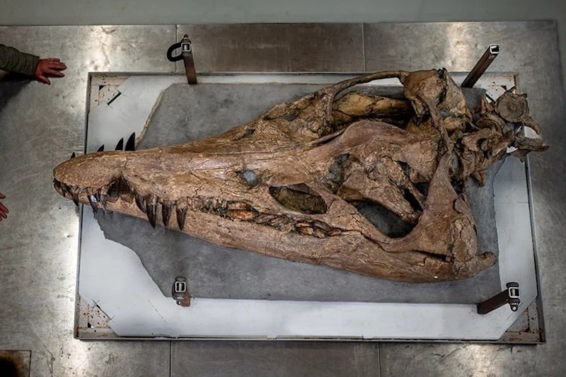 Bu kafatası, yaklaşık 150 milyon yıl önce okyanuslarda dolaşan vahşi bir deniz sürüngeni olan pliosaur’a aitti.