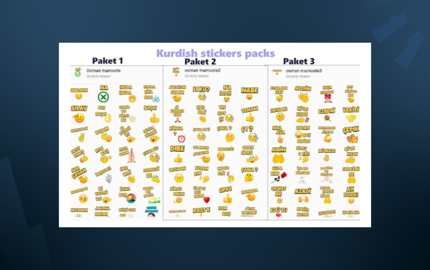 Dicle Üniversitesi Kürt Dili ve Edebiyatı Bölümü Öğretim Üyesi Osman Aslanoğlu, WhatsApp’taki mesajlaşmaların Kürtçe de yapılabilmesi için Kürtçe yazılar içeren sticker paketleri oluşturdu. Bu stickerlar, Kürtçe’nin Kurmanci ve Zazaki lehçelerinde 4’der ve 2’şer paketler halinde kullanıma sunuldu. Her paket 30 stickerdan oluşuyor.